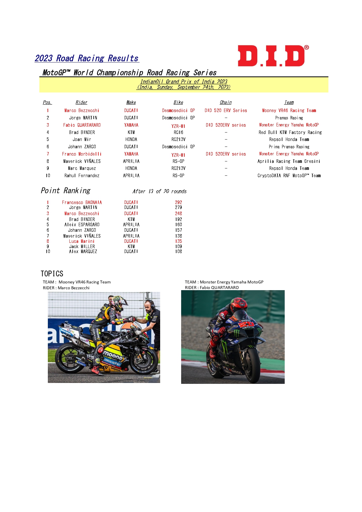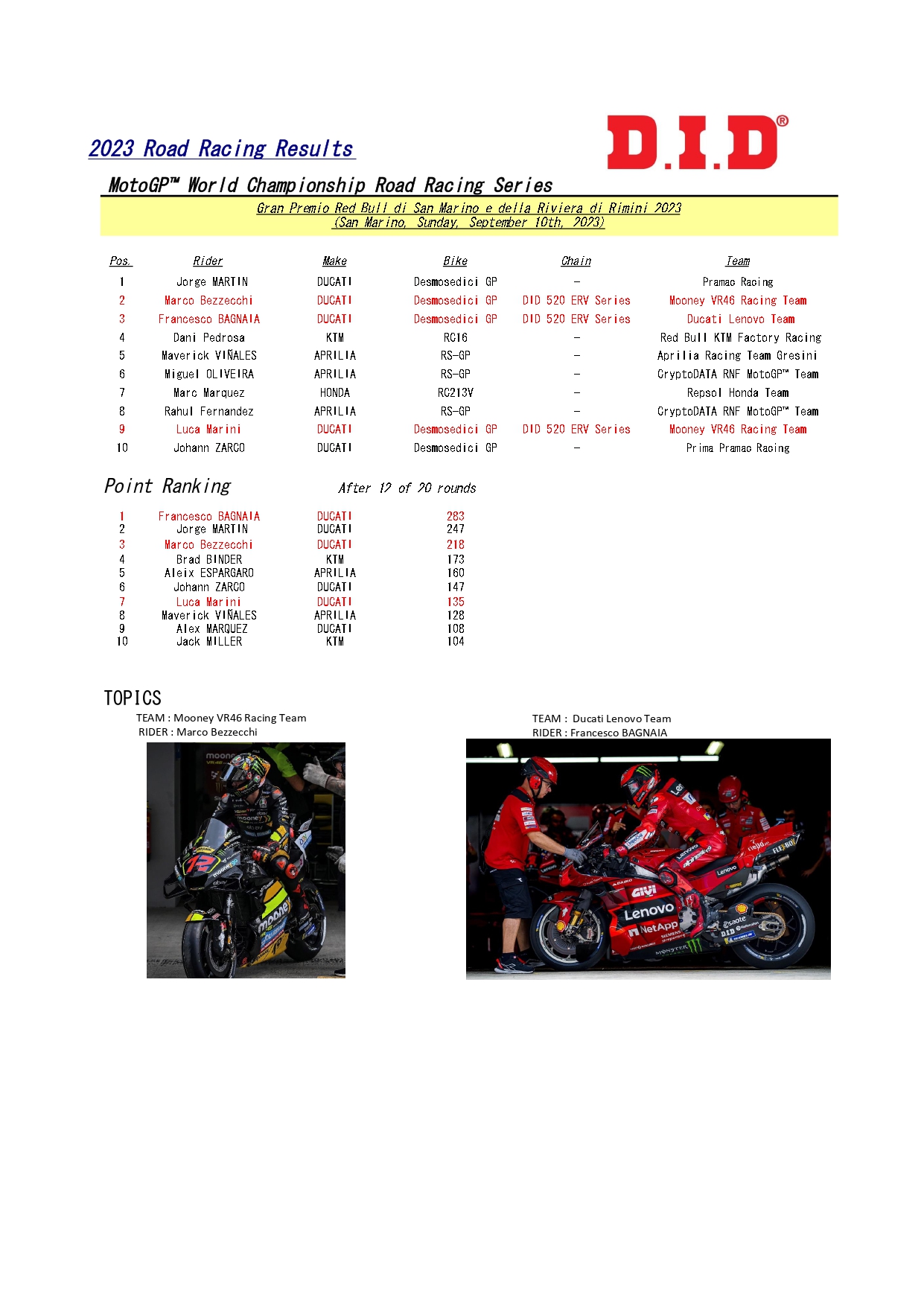 回列表 【MotoGP賽事成績分享】MotoGP 2023 Round 12~13 比賽結果出爐! 再次恭喜 Marco Bezzecchi Ducati 奪分站冠軍!! 工欲善其事必先利其器,在經過數百場世界最激烈實戰的淬鍊,證明了DID #520ERV系列 賽車競技鏈條的強大實力!! #MotoGP #冠軍車隊 及 #冠軍車手 指定選用之 #賽車鏈條!!! DID 鏈條絕對是您最明智的選擇,全系列產品100%#日本原裝進口 適合車種別&鏈條選用表,請參考D.I.D官網 https://didmc.com/chain/ #DID #總代理 @DID鏈條 大同工業株式会社 重車鏈條/工業鏈條 #DID傳動鏈條 #台灣總代理 #慶澧股份有限公司