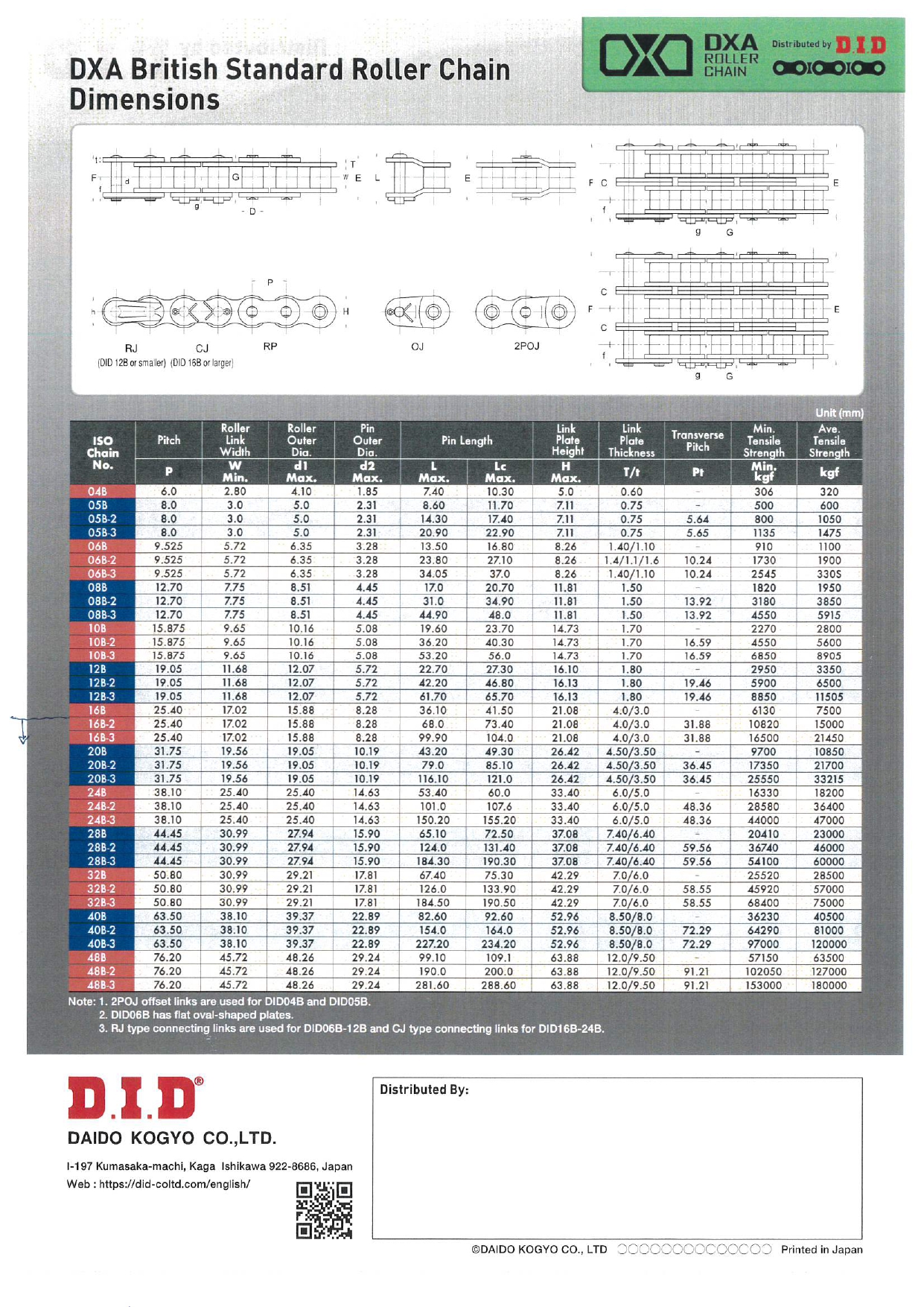 回列表 "DXA" British standard roller chain 日本D.I.D 新品牌歐規滾子鏈條 是一種以歐洲製造生產機械設備為主要使用的傳動鏈條, D.I.D 公司官網 : 感謝您的關注,如對日本 D.I.D 產品有任何需求或鏈條傳動等相關問題,